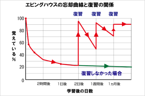 このグラフは、同じエビングハウスの忘却曲線に、定期的な復習をした場合の記憶率を記入したものです。つまり、「定期的に復習をすれば、その記憶は確実に定着する」という事ご理解いただけると思います。